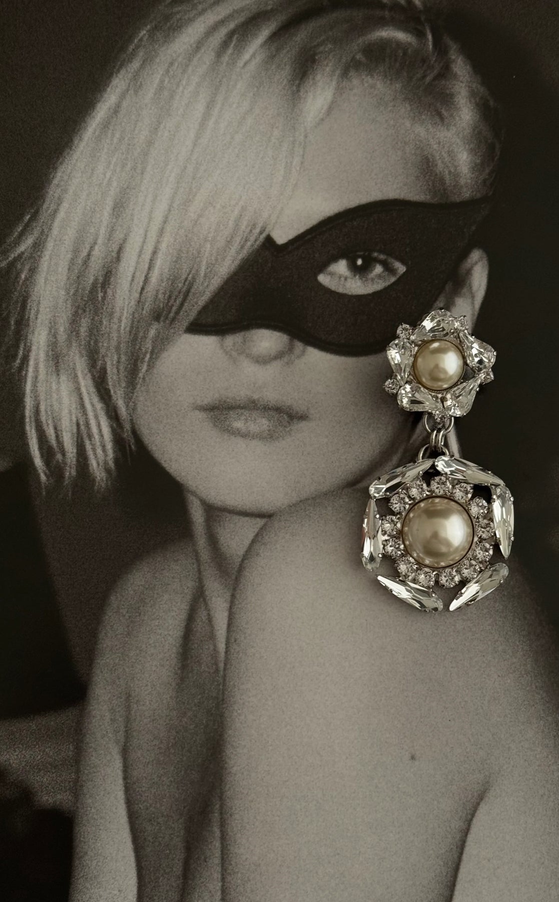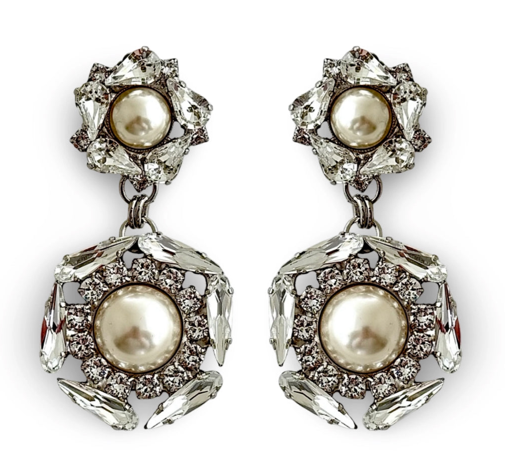Crystal embellished earrings in Clear Crystal tones with Antique Faux Pearls.