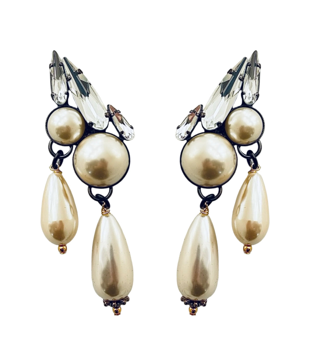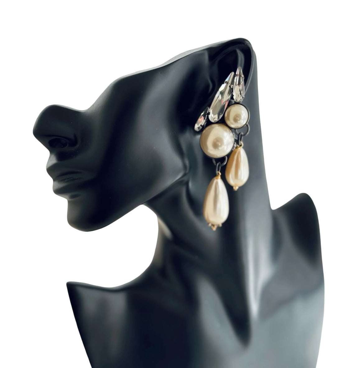 Crystal Embellished Cream Faux Pearl Twin Drop earrings in Clear Crystal Detailing.